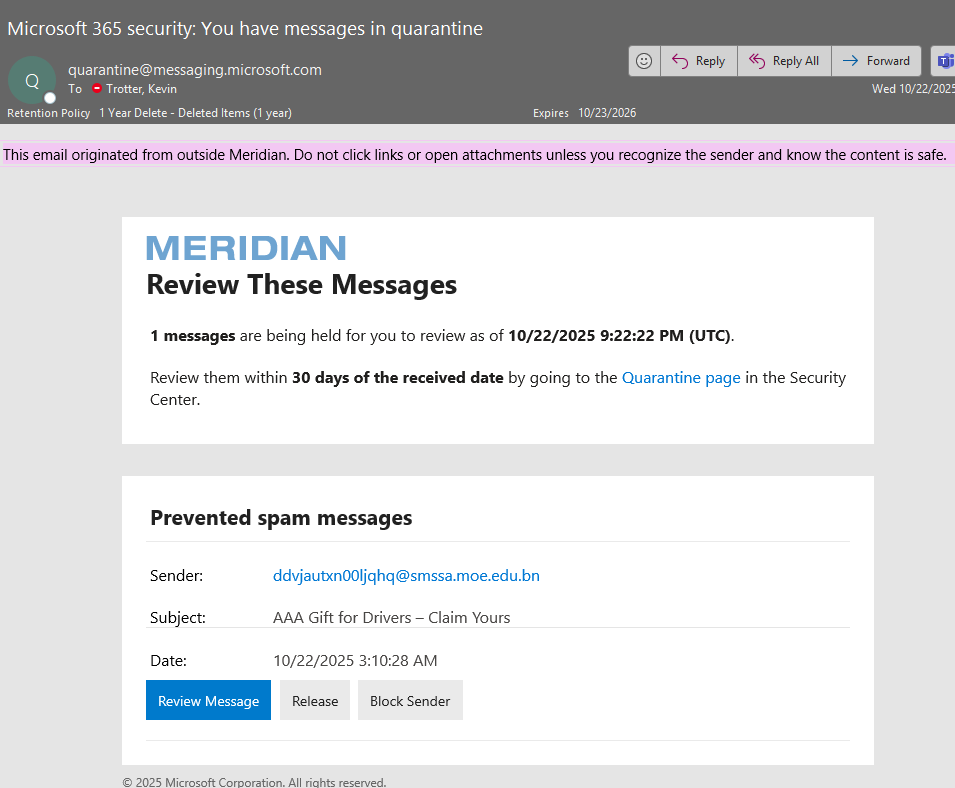 Meridian International Center has set up Quarantine for incoming email messages in Office 365 to allow users to identify messages that have been filtered as spam, bulk mail, phishing mail and mail that contains malware. This is in efforts to better manage messages that might have been falsely identified as Spam by Microsoft.