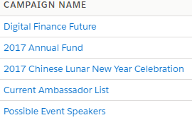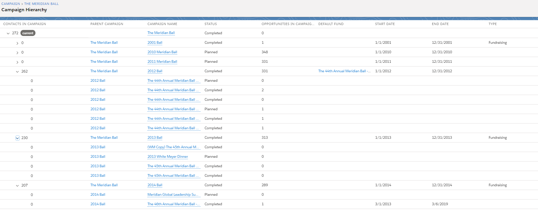 We can create Campaign Hierarchies to keep track of different groups of people within the same Campaign-type. Below you can see a clip of the Meridian Ball Campaign hierarchy, which shows each Ball and the sub-Campaigns associated with each one. Campaign hierarchies follow a similar design of Account hierarchies.