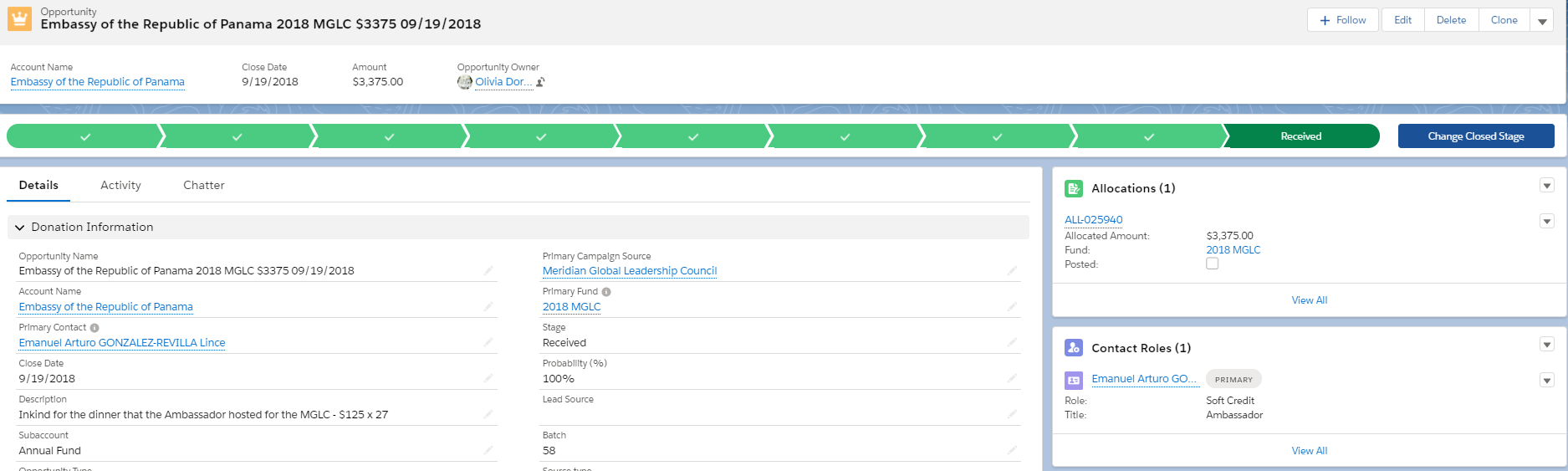 In Opportunities, we can track the amount of the expected payment/deal, stage of the deal (expected, in process, etc.), and therefore the probability of the deal coming through, when the deal/payment should be expected and when it was paid in, what Fund it is associated with, and more. Opportunities are very helpful for tracking any and all incoming funds, from tickets to the Ball to grant applications for Projects.