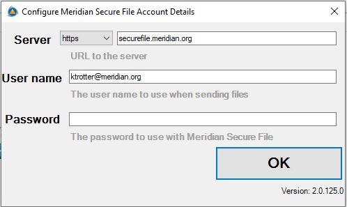 - You should be prompted with options to enter Server URL (securefile.meridian.org) Username (work e-mail) and password (Microsoft 365 password). If not, click the chevron and "Options" to initiate Login (see image 2 below).
