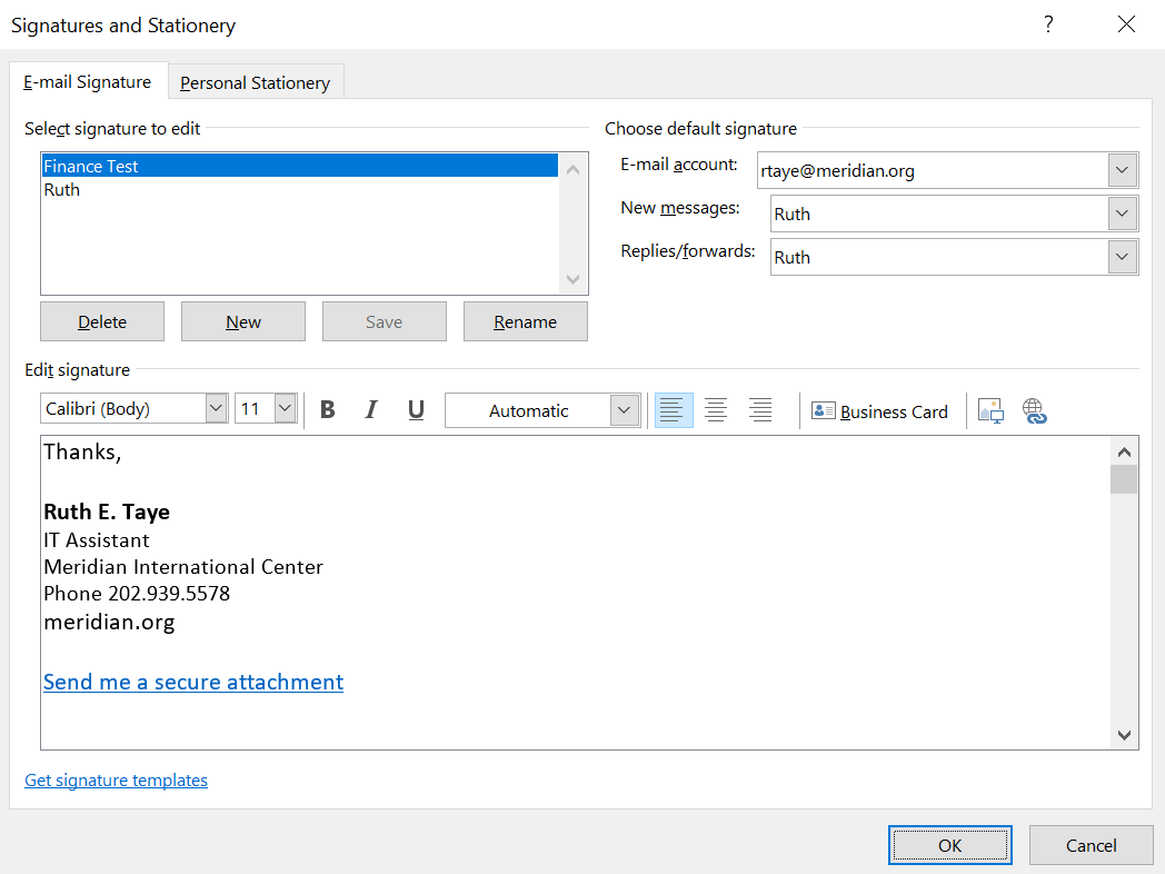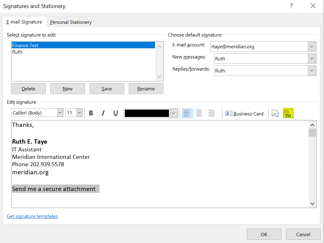 Your signature will now have a link on the text you have specified, like the following. You can make this your default signature if you wish by changing the settings under “Choose default signature”. Press “Ok” when done.