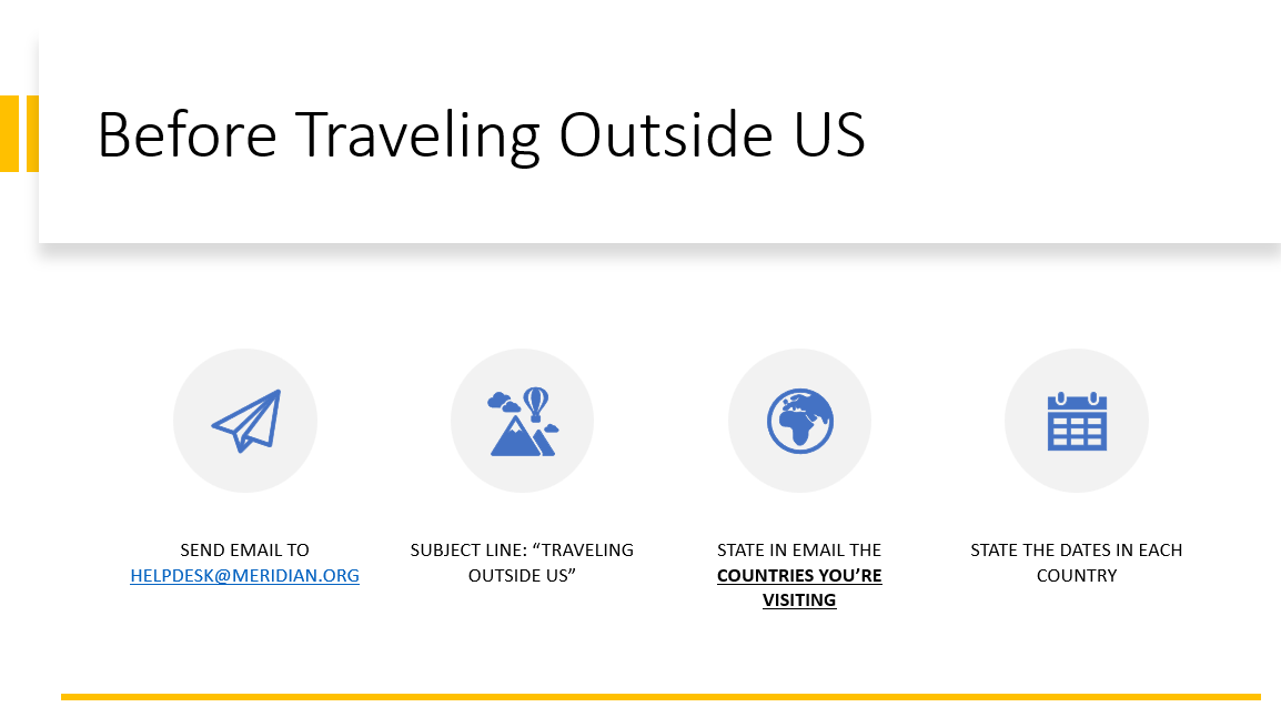 As far as process, please send email to helpdesk@meridian.org. Include subject line "Traveling Outside US". Also, state the country or countries visiting and dates of arrival.